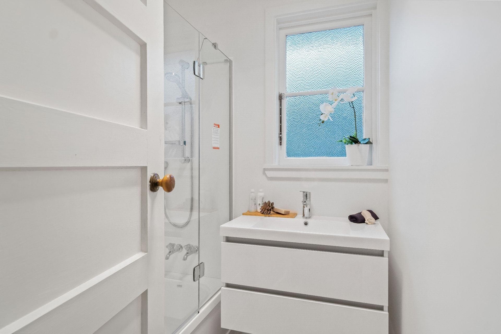Newly renovated bathroom with shower over bath and seperate toilet.